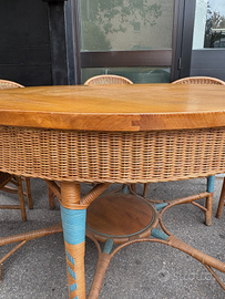 Il tavolo presenta una superficie in legno, con una bellissima cornice inferiore e gambe in rattan incrociato. Le sedie sono interamente realizzate in rattan, con una particolare lavorazione nei minimi dettagli. Completano le opere piccole fasce blu che rendono l'intero set di pregio e di difficile reperibilità.