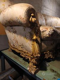 - Ampio Divano a 4 posti: La struttura in legno massiccio, finemente intagliato con motivi floreali e dorato, è in condizioni perfette. Come da foto, necessita di un intervento di restauro esclusivamente sulla tappezzeria dei cuscini e della seduta.