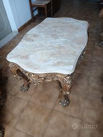- Tavolino da Caffè: Elegante tavolino con un prezioso piano in marmo dalle calde venature, sorretto da gambe e una cornice riccamente intagliate e dorate.