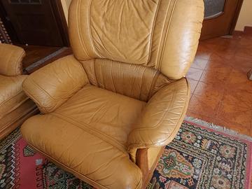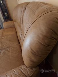 Divano 3 posti e 2 poltrone in pelle con struttura in legno. ottime condizioni (unico segno di usura nella cucitura della seduta centrale del divano,come si vede dall' ultima foto. Motivo per cui è sempre stato usato con fodere di copertura).