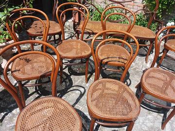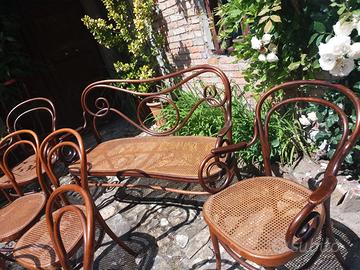 Vendo salotto Kohn viennese originale marchiato o etichettato come da foto composto da: un divanetto, due poltrone, due sgabelli, sei sedie.