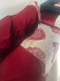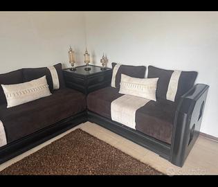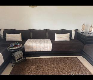 Vendo salotto marocchino tenuto benissimo, il contenitore a destra è molto ampio è grande 70 cm . compreso dei due tavolini all'angolo ( che contengono alcuni decorazioni e vassoio con bicchieri e teiera tradizionale del Marocco) il tavolino a sinistra è fatto di 3 tavolini che si incastrano uno sotto l'altro . compreso di due tappeti uno beige e uno marrone, compreso del quadro "scritta sul muro " e si si vuole anche tavolo di vetro ( ha un piede da sistemare) e sei sedie . Il divano come si vede nelle foto è marrone e beige e l'ho fatto anche rosso e beige come si vede nella foto n 5 e anche lilla e dorato nella foto n6 . Misura 3,20 e ai lati 1,50 come si vede in foto . Ma sono componibili come uno vuole perché ogni pezzo è lungo 1,50 .