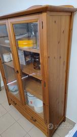 Armadio con antine con vetro e cassetto, mobile basso con 3 antine e 3 cassetti, tavolo con 6 sedie sempre in legno massello.