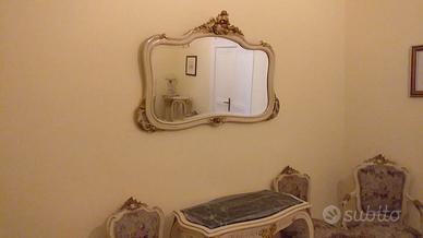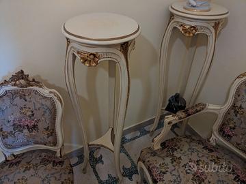 Vendesi salotto stile Luigi XV acquistato prima del 1960 e perfettamente conservato. Colore avorio chiaro, con intarsi a rilievo in foglia oro. Tessuto originale d'epoca con temi floreali a rilievo. Trattamento antitarlo.Ideale per arredare ville antiche o per allestire set cinematografici per riprese d'epoca. Composizione: 1 divano a tre posti, 2 poltrone con braccioli, 6 poltroncine senza braccioli, 2 cantoni, 1 Tavolino consolle, 1 specchio.