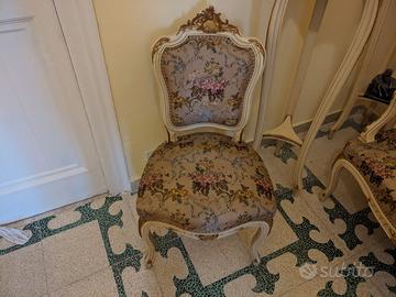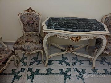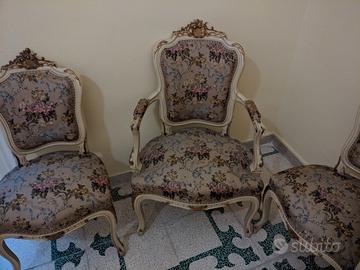 Vendesi salotto stile Luigi XV acquistato prima del 1960 e perfettamente conservato. Colore avorio chiaro, con intarsi a rilievo in foglia oro. Tessuto originale d'epoca con temi floreali a rilievo. Trattamento antitarlo.Ideale per arredare ville antiche o per allestire set cinematografici per riprese d'epoca. Composizione: 1 divano a tre posti, 2 poltrone con braccioli, 6 poltroncine senza braccioli, 2 cantoni, 1 Tavolino consolle, 1 specchio.
