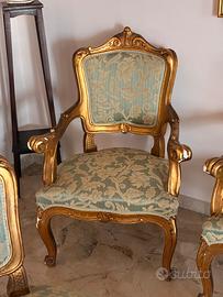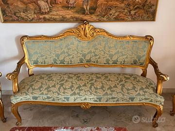 Si vende salotto LuigiXVI in oro zecchino composto come da foto da 1 divano, 2 poltrone,1 tavolino con base in marmo, 4 sedie ed una specchiera con piedi e base in marmo come il tavolino ed 1 arazzo …. Prezzo trattabile con spedizione a carico dell’acquirente