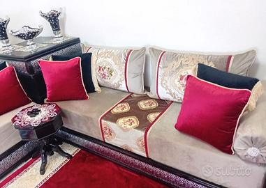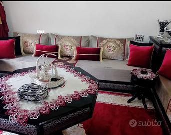 Vendo salotto marocchino completo (tappeto tenda no)misura uno da 2 metri +uno di 3.30 metri+angolo 70 /70 + materassi + copri divano cuscini + tavolo grande + 2 tavolini piccoli .