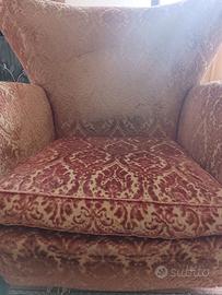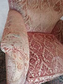 Salotto composto da 3 elementi: un grande divano tre posti e due poltrone. In velluto damascato rosa antico su struttura e piedi di legno massiccio. Molto solido, anche se la tappezzeria delle due poltrone è logora sui braccioli e a tratti sbiadita. Quella del divano è solamente schiarita sullo schienale. I pezzi sono vendibili anche singolarmente: DIVANO 80€, POLTRONE 30€/pezzo