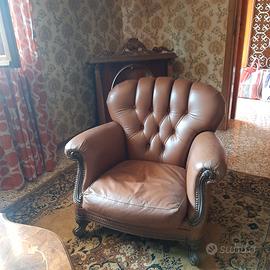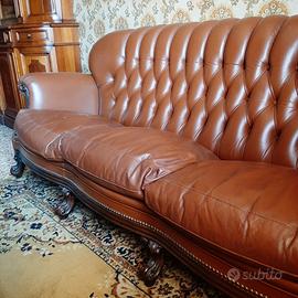 Salotto stile classico in pelle marrone, composto da un divano tre posti, due poltrone, un tavolino ed un tappeto.