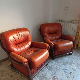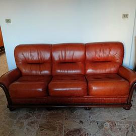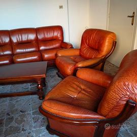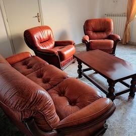 Salotto in pelle con bottoni rivestiti dello stesso materiale .La struttura è solida con una base leggermente rialzata con piedini è adattabile ad ambienti classici o moderni. Il salotto si trova in un secondo piano a Randazzo ( CT ) e non si effettua spedizione .