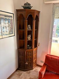 Vendo salotto composto da mobile libreria, mobile angoliera, mobile piattaia, tavolo rotondo allungabile con sei sedie, divano 3 sedute e due poltrone in velluto rosso, tavolino rotondo.