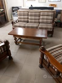 salotto rustico in legno massiccio, comprensivo di divano letto a tre posti, tavolino e due poltrone. la stoffa dei cuscini è sfoderabile.