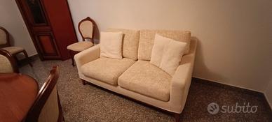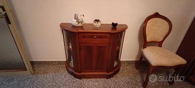 Salotto "vintage" come nuovo composto da: mobile con vano tv lungo 300 cm e profondo 45 cm + angolo (al momento staccato) di 60 cm Tavolo rotondo ( allungabile) diametro 116 cm alto 80 con 6 sedie Divano 2 posti comodi lungo 160 cm, profondo 90 e alto 90 Console con 2 vetrinette laterali, lungh. 104, alt. 80, prof. 38 Arazzo Smontaggio e trasporto a cura del compratore Si trova ad Altedo