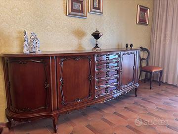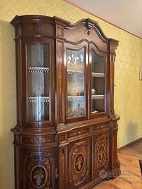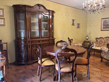 Vendo soggiorno composto da tavolo con quattro sedie, un grande mobile basso tipo buffet (circa 2,20 m), e una vetrina espositiva con sportelli inferiori, ideale per mostrare argenteria e oggetti pregiati.