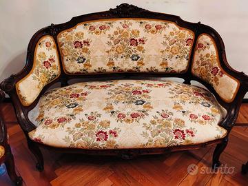 Elegante salotto in stile classico composto da divano a 2 posti e due poltrone abbinate. Struttura in legno massello scuro con raffinati intagli artigianali e linee sinuose. Rivestimento in tessuto damascato floreale dai toni caldi, in ottime condizioni, senza strappi né macchie.