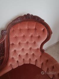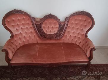 Salotto come nuovo. In velluto e struttura in legno massello. Tappezzeria e struttura in perfette condizioni. Formato da un divano, due poltrone e tavolino.