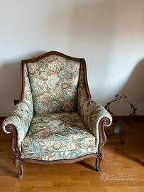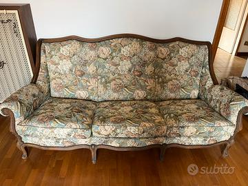 Salotto composto da un divano a tre posti e due poltrone stile liberty con profili in legno e tessuto damascato