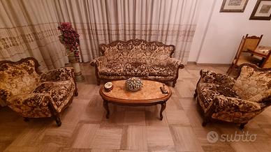 Il salotto è completato da un tavolino coordinato, con piano elegante e gambe sagomate, perfettamente in armonia con l’insieme.