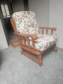 salotto composto da 2 poltrone e divano tre posti,(non in foto, completo dei sei cuscini), legno massello, stile rustico/country, cuscini sfoderabili, perfetto per taverna, compreso tavolino