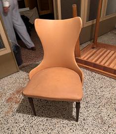 Le poltroncine presentano una linea avvolgente e sinuosa tipica del design dell’epoca, rivestite in simil pelle color cuoio con piedini in legno scuro. Comode, solide e molto scenografiche, ideali per living, studio, ingresso o showroom. Portano alcuni inevitabili segni del tempo ma nel complesso sono in ottimo stato.