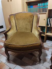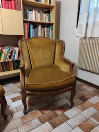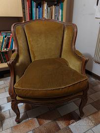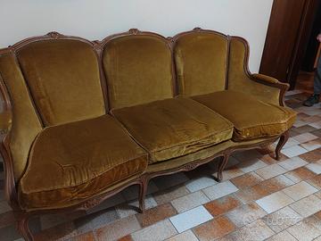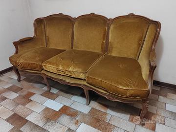 Salotto vintage color senape composto da un divano a 3 posti e due comode poltrone.