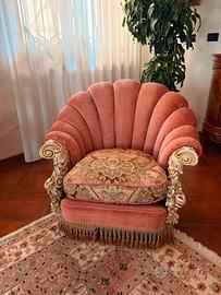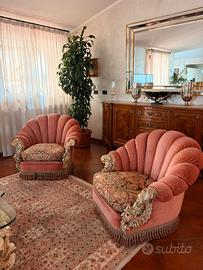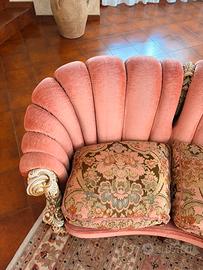 Vendo splendido salotto vintage composto da divano 3 posti e 2 poltrone abbinate, in perfetto stile classico con richiami barocchi. Il set è caratterizzato da: * Rivestimento in velluto color rosa/salmone, molto elegante e raffinato * Struttura solida con braccioli intagliati e decorati a mano * Sedute comode con cuscini originali in tessuto damascato * Dettagli con frange decorative che esaltano lo stile retrò * Forma particolare “a conchiglia” che rende il salotto unico e di grande impatto Ideale per chi ama l’arredamento vintage, classico o shabby chic, perfetto anche per ambienti eleganti o di rappresentanza. Condizioni: buone, ben tenuto (come da foto) Ritiro: a carico dell’acquirente Per qualsiasi informazione o altre foto, contattami senza problemi.