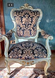 salotto primi Anni 70s composto da divano 3 posti e 2 poltrone; mobili in stile veneziano, finemente decorati, ma il velluto damascato è danneggiato soprattutto nei braccioli e necessita di restauro, serve nuovo rivestimento; attualmente si trovano smontati a Parma; ritiro a carico dell'acquirente.