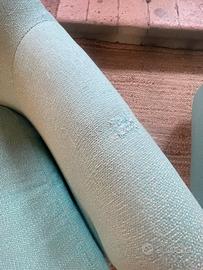 Bellissimo salottino vintage originale anni 70, composto da 2 poltroncine e 1 divanetto a due posti, tappezzeria in cotone a trama grossa melange verde acqua e piedini in faggio. Condizioni ottime, fatto lavare e sanificare, presenta un unico difetto sul bracciolo di una delle poltroncine, rammendato dal tappezziere affinché lo strappo non si estenda.