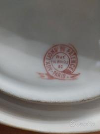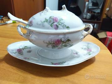 Elegante salsiera in porcellana aux lions de faience rue de rivoli 90 con decorazioni floreali e dettagli dorati. Purtroppo il coperchio ha il manico rotto ma si può tranquillamente utilizzare senza, è tutto un blocco con il piatto