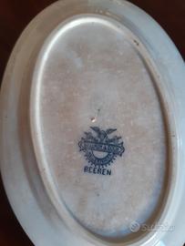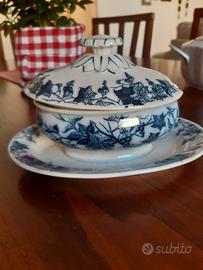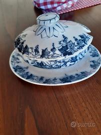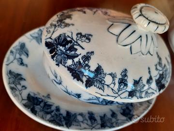Bellissima salsiera antica pregiata porcellana belga Villeroy & Boch, metà dell'800 decori blu notte con grappolo d'uva, fogli e fiorellini su fondo bianco. Il piattino sottostante è attaccato alla ciotola. completa di coperchio. Posso spedire con Poste italiane Condizioni perfette