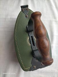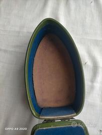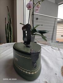 Originale salvadanaio vintage anni '50/'60 a forma di antico ferro da stiro. Struttura presumibilmente in compensato, ricoperto esternamente in materiale tipo pelle verde con decori dorati. Internamente ricoperto di fine velluto blu e beige. Cerniera, chiusura e manico in ferro, maniglia in legno. Scritta dorata sui fianchi: PER LE VACANZE.