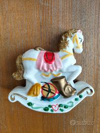 Statuetta decorativa in ceramica a forma di cavallo a dondolo, utilizzabile come salvadanaio ⚠️ La parte sotto presenta delle piccole imperfezioni, ma non compromettono la funzionalità e il lato estetico visibile Colore: bianco con dettagli dorati ceramica smaltata dipinta a mano #salvadanaiocavalluccio #cavalloadondolo #ceramica #decorazione #salvadanaiovintage #collezionismo #arredamento #homedecor #vintagehome #ideeregalo #salvadanaio