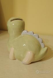 Savaldanio a forma di dinosauro in ceramica dipinto a mano. Il salvadanaio è alto circa 7 cm ed è largo circa 8cm.