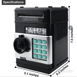 Salvadanaio per soldi a moneta e/o carta. Funziona con batteria. Suoneria che scandisce l’utilizzo dei numeri della combinazione. Apertura a maniglia stile cassaforte. Condizioni: Nuovo (mai utilizzato, conservato scatola di origine). Colore: Nero