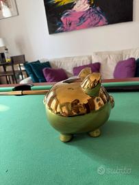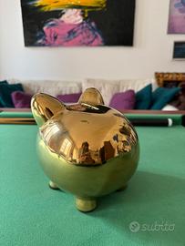 Bellissimo salvadanaio a forma di porcellino, realizzato in ceramica e rifinito con rivestimento dorato, che lo rende allo stesso tempo un oggetto funzionale e un vero elemento di design.