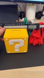 Salvadanaio ispirato all’iconico cubo “?” di Super Mario, realizzato in plastica rigida con finitura gialla e dettagli bianchi in rilievo.