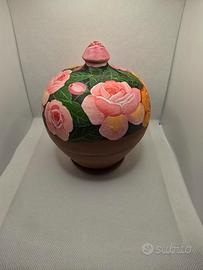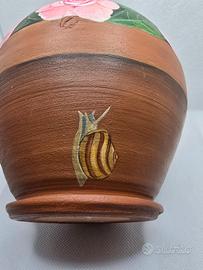 Salvadanaio in terracotta pitturato a mano con colori acrilici. Altezza cm. 16,5 Circonferenza cm. 12,5