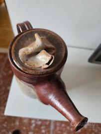 Teiera in gres con corpo cilindrico. Il coperchio è concepito come elemento plastico autonomo.