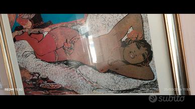 Un elegante nudo disteso con calze rosse, arricchito da dettagli di natura morta, in perfetto stile novecentista.Le opere di Fiume sono note per la loro sensualità e il richiamo alle atmosfere mediterranee ed esotiche. Questo pezzo rappresenta un investimento artistico e un elemento d'arredo di grande classe e raffinatezza.Cornice: Splendida cornice dorata d'epoca, pronta per essere appesa. Condizioni: Ottime condizioni generali, come visibile dalle foto.