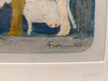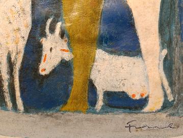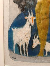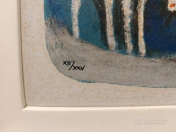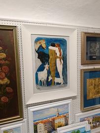 Questa affascinante opera grafica di Salvatore Fiume cattura l'essenza del suo stile novecentesco attraverso una scena pastorale intrisa di lirismo e simbolismo. La composizione presenta due figure abbracciate in primo piano, rese con forme sintetiche e colori caldi, immerse in un'atmosfera blu profondo popolata da figure animali che richiamano la pittura rupestre e il mito mediterraneo. L'esemplare è numerato XII/XXV in basso a sinistra e reca la firma autografa dell'autore sul lato destro. La tecnica evidenzia una texture materica ricca e vibrante, tipica delle edizioni di pregio dell'artista. L'opera è presentata in una cornice moderna bianca che ne esalta la luminosità cromatica. Misure 67,5 x 47,5 Con cornice: 87,5 x 67,5