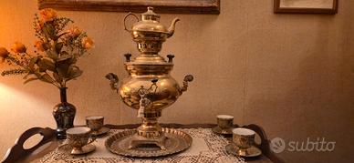 Samovar originale con tazzine acquistato negli anni '70 ad Instambul completo di vassoio e 4 tazzine Data la natura dell'oggetto preferirei il ritiro a mano da parte dell'acquirente ma sono comunque disponibile a spedire con adeguata confezione ben imbottita ma senza assumermi responsabilità dei possibili danni del trasporto
