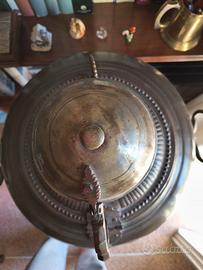 Samovar russo integro, di grandi dimensioni, alto 70 cm e largo 50 cm compresi i manici. Oggetto decorativo, molto di figura e particolare. Credo sia ottone.