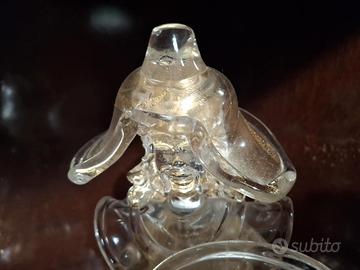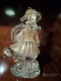 Scultura in vetro di Murano lavorata a mano, raffigurante un samurai in posizione dinamica, con katana e scudo. L’opera è realizzata in vetro trasparente con inclusioni di foglia d’oro (oro zecchino), una tecnica tipica delle fornaci muranesi di pregio.
