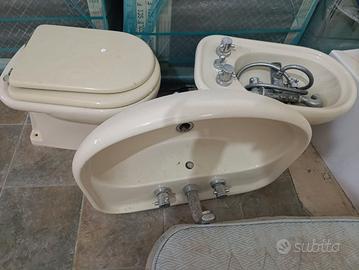 Vendesi sanitari in ceramica color crema: wc, bidet e lavabo con colonna. Completi di rubinetteria come in foto e si regala specchio con ante scorrevoli. Immediato realizzo, visto e piaciuto, prezzo trattabile, ritiro in sede.