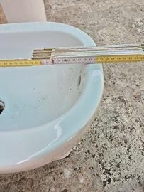 Set di sanitari in ceramica distanziati GLOBO in buone condizioni come da foto. Il set comprende: WC con misure 50x36; Bidet con misure 50x36 e Lavabo sospeso su colonna con misure 65x55. Tavoletta WC in buone condizioni. Cassetta di scarico alta.