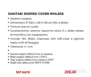 Vendo causa errata predisposizione coppia sanitari sospesi marca Althea modello Cover: vaso + bidet+ sedile slim soft close. Nuovi, mai montati/utilizzati. nessun danno materiale: ceramica colore bianco lucido disponibili altre informazioni e schede tecniche disponibili foto a richiesta