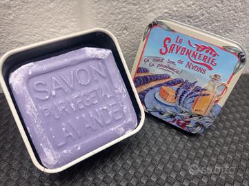 Saponetta lavanda con scatola in latta scritte in rilievo, stile vintage La Savonnerie de Nyons
