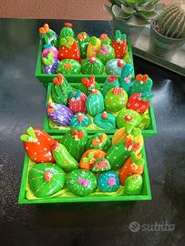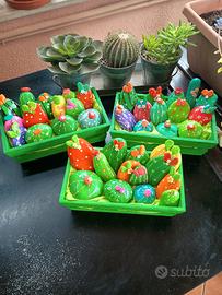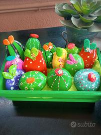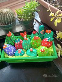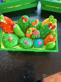 Sassi di mare dipinti , decorati e smaltati a mano, pezzi misti,soggetto piantine di cactus, richiesta di 12 euro per la cassettina di legno con dentro 12 pezzi