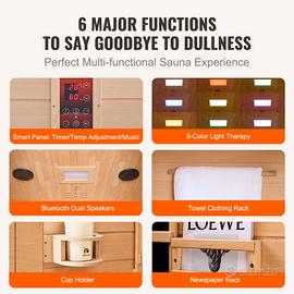 Piacevole esperienza nella sauna: goditi la musica, l'illuminazione, il controllo della temperatura e le funzioni timer per rendere la tua esperienza nella sauna più piacevole. Il pannello di controllo integrato consente di gestire facilmente queste funzionalità. Un appendiabiti incluso offre un posto dove appendere asciugamani e vestiti.