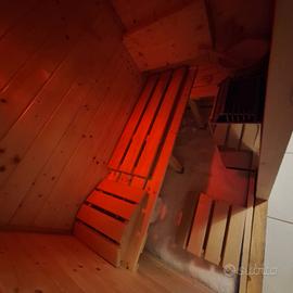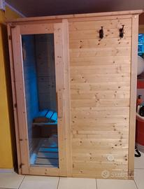 sauna fillandese compatta da interno in legno di abete rosso. con dimensioni contenute p 90 x l 140 x h 190 perfetta per creare un angolo relax anche in casa. Stufa elettrica (bracere) da 3 kw con accessori inclusi pietre laviche secchio mestolo clessidra pedane legno sale..ecc in pratica una sauna domestica perfetta per ogni giorno.
